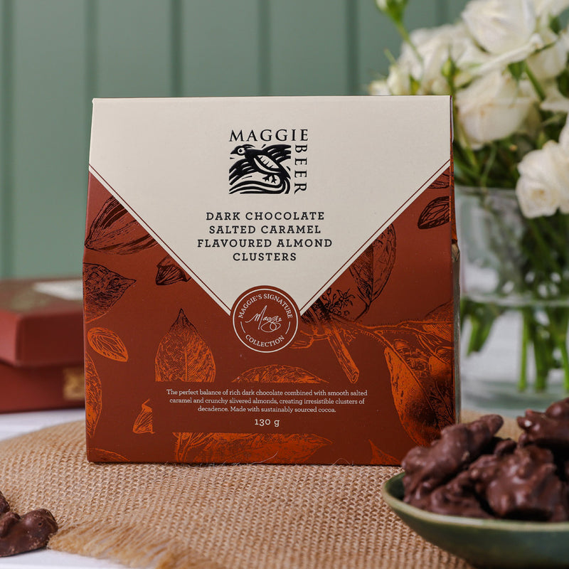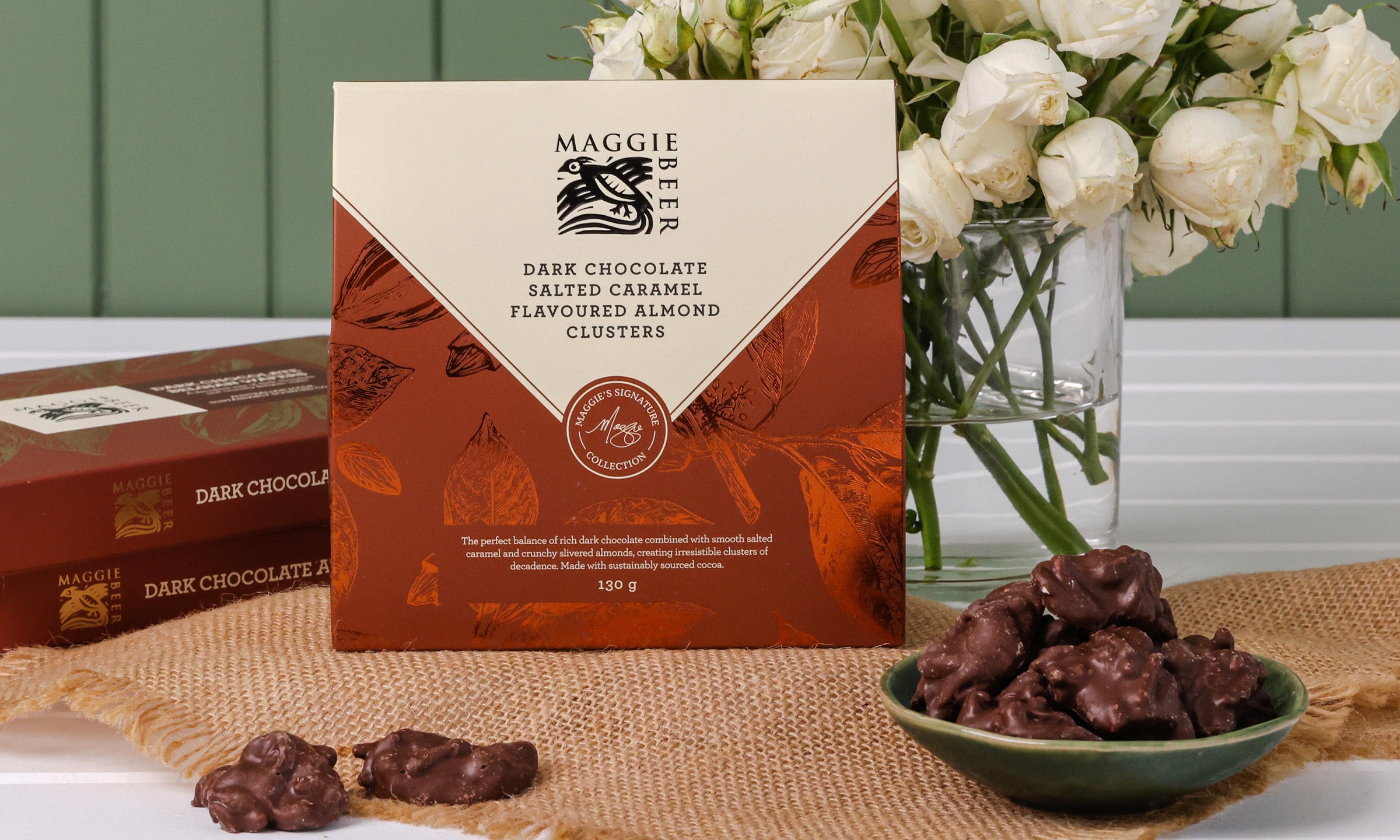 Bite into a caramel and almond cluster featuring rich, smooth caramel and crunchy almond flavor, all encased in boldly sweet 80% dark chocolate.