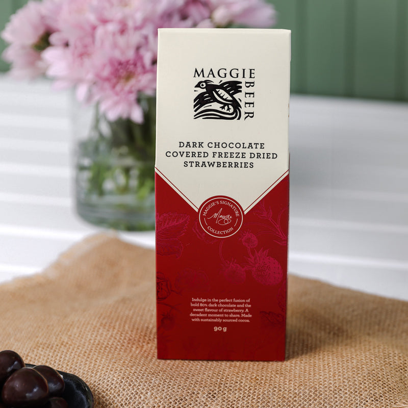 Crunch on a freeze-dried strawberry fully covered with a generous amount of decadent dark chocolate.