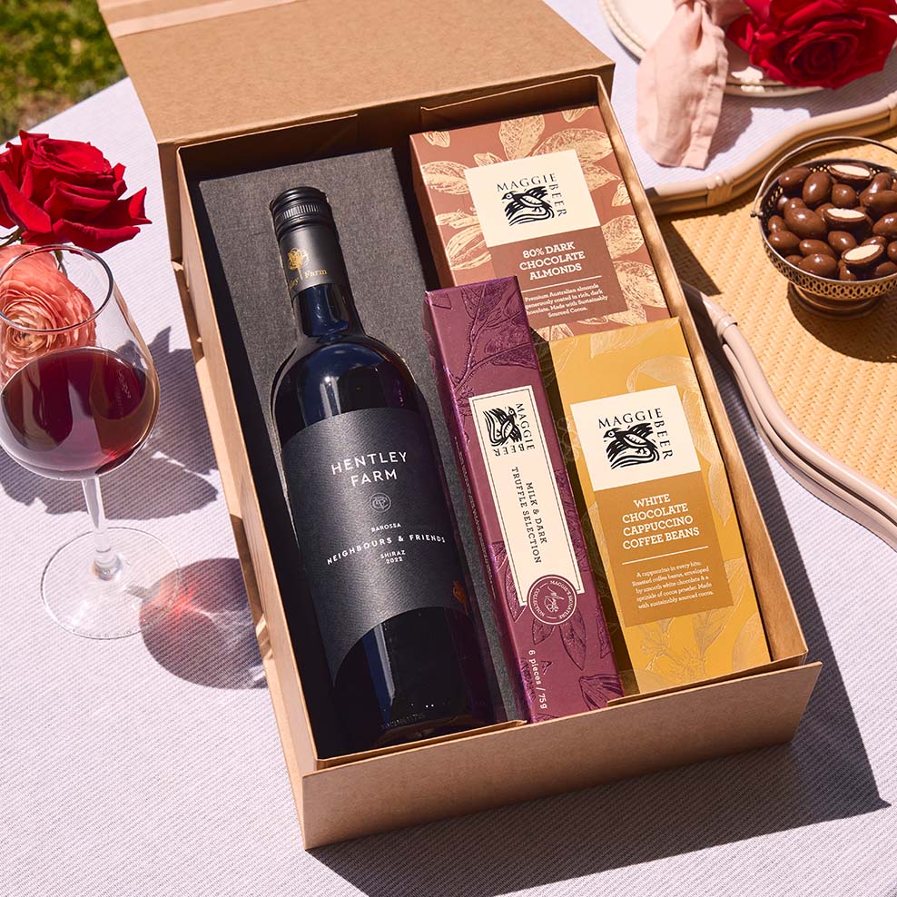Neighbours, friends, and family can come together to celebrate with a glass of Hentley Farm wine and decadent treats with this chocolate hamper. Bliss indeed.