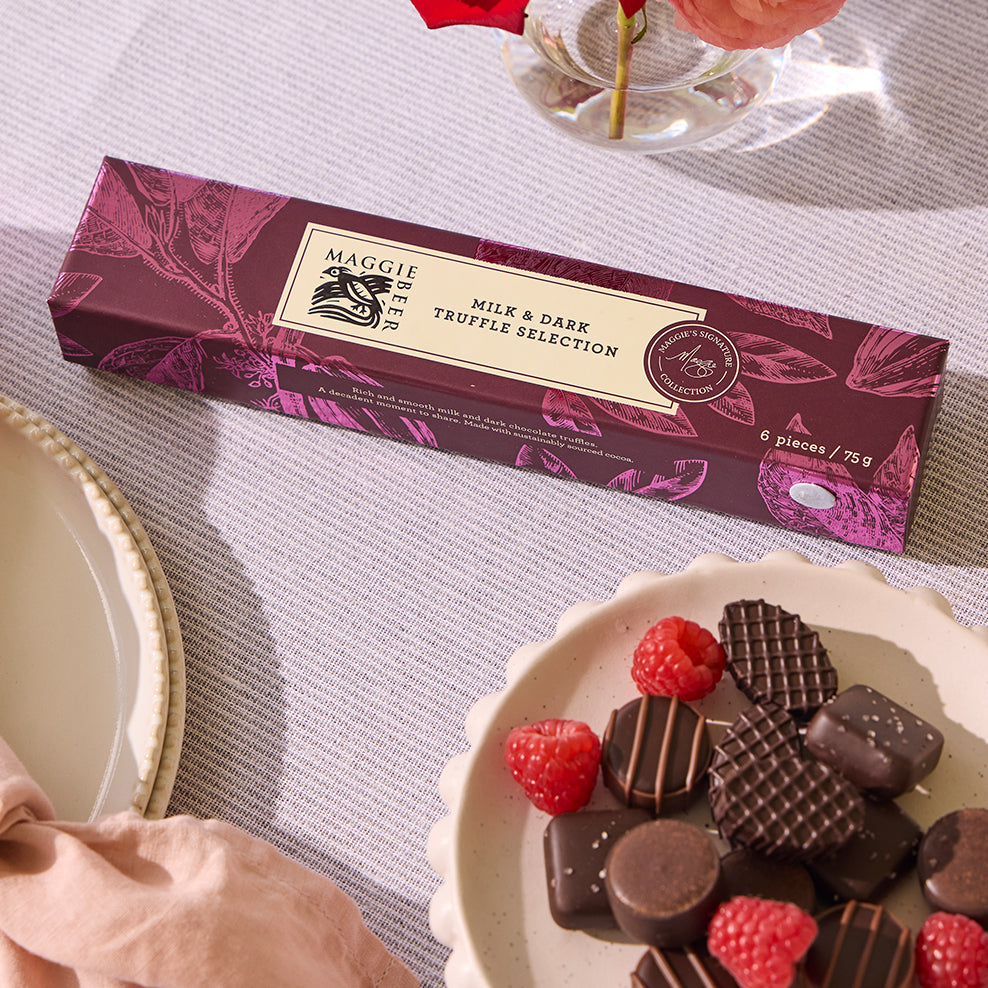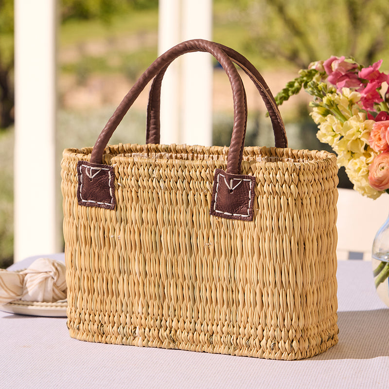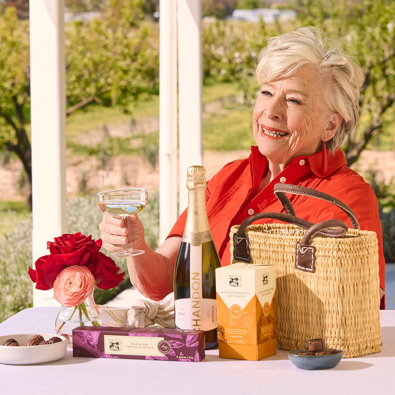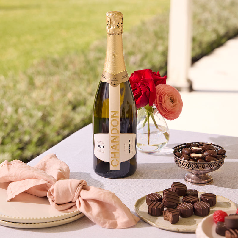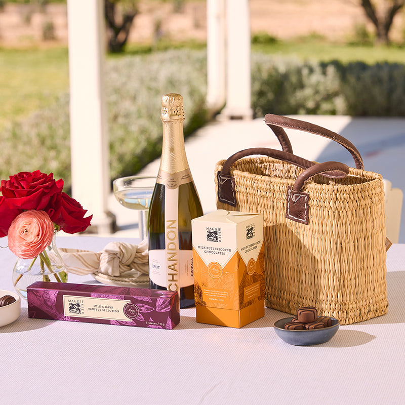 Peek inside this French market basket mini tote and discover Chandon for a toast and chocolate for a treat.