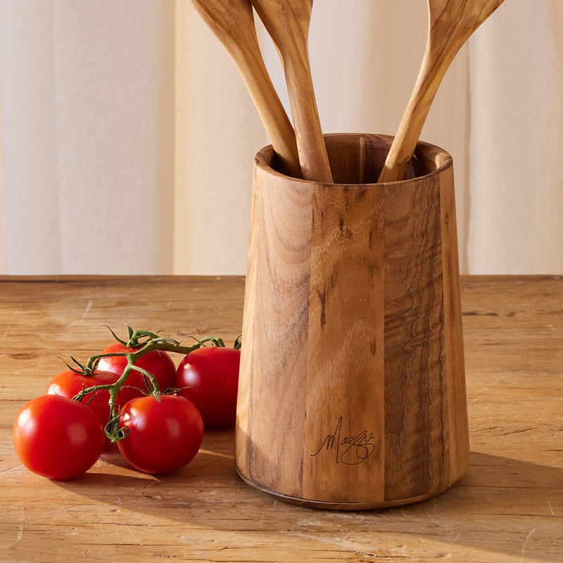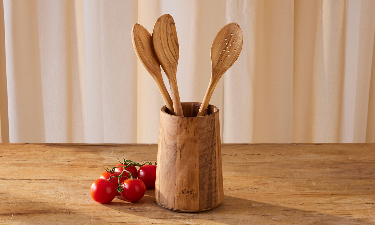 Add a natural look to the kitchen with a teak wood utensil holder, a great friend to tools of the trade.
