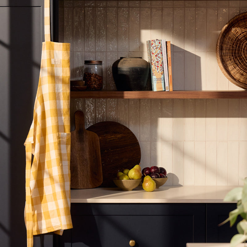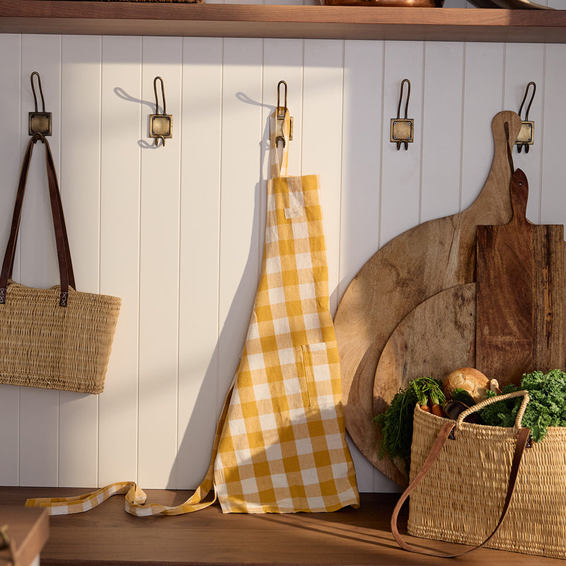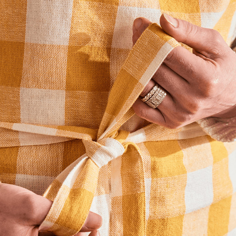 Keep your clothing clean and enjoy warm, yellow tones with this gorgeous gingham apron from Maggie.