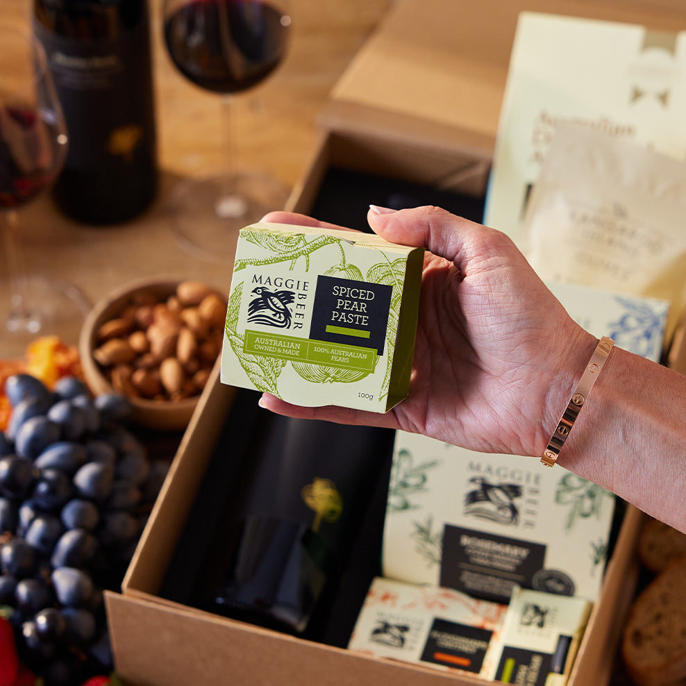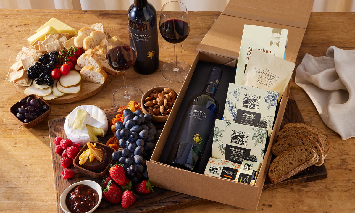 Pour a glass of Hentley Farm's Barossa Shiraz, sit back and enjoy some tasty nibbles with this gourmet hamper.
