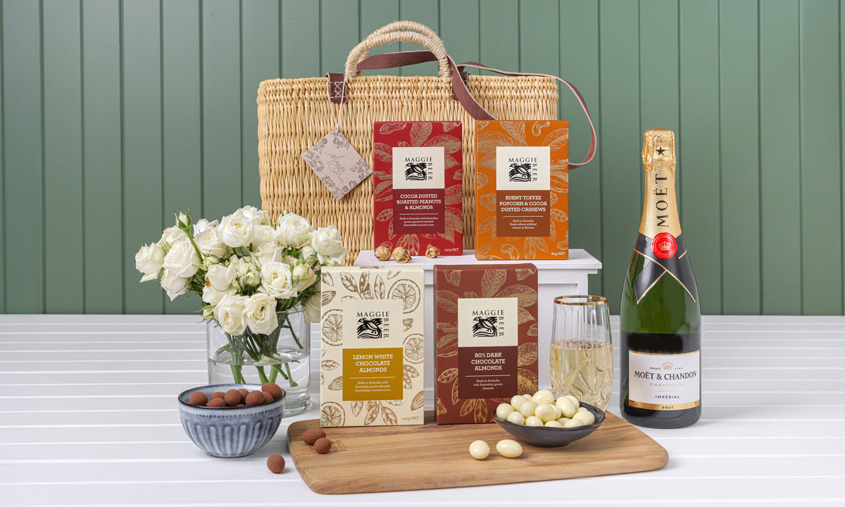 Enjoy a fabulous small French market basket, French champagne and Maggie's decadent sweet nuts.
